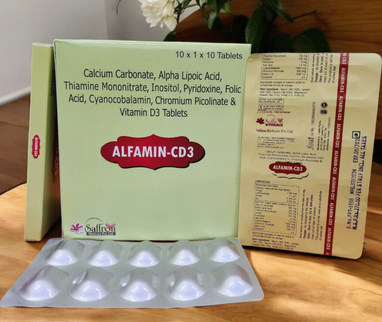 Composition: Calcium Carbonate 500mg, Alpha Lipoic Acid 200mg, Benfotiamine 150mg, Inositol 100mg, Pyridoxine 3mg, Folic Acid 1.5mg, Methylcobalamin 1500mcg, Chromium Picolinate 200mcg, Vit. D3 1000 I.U. Tablets